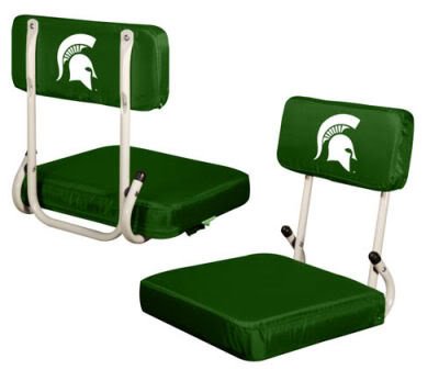 Made of 420 denier polyester. Measures 13.5" x 12" x 14.5". Frame is made of white powder coated steel tubing. Two hinged clips on bottom front for attaching to bleacher. Back rest is angled slightly for added comfort. School logos on front and back.